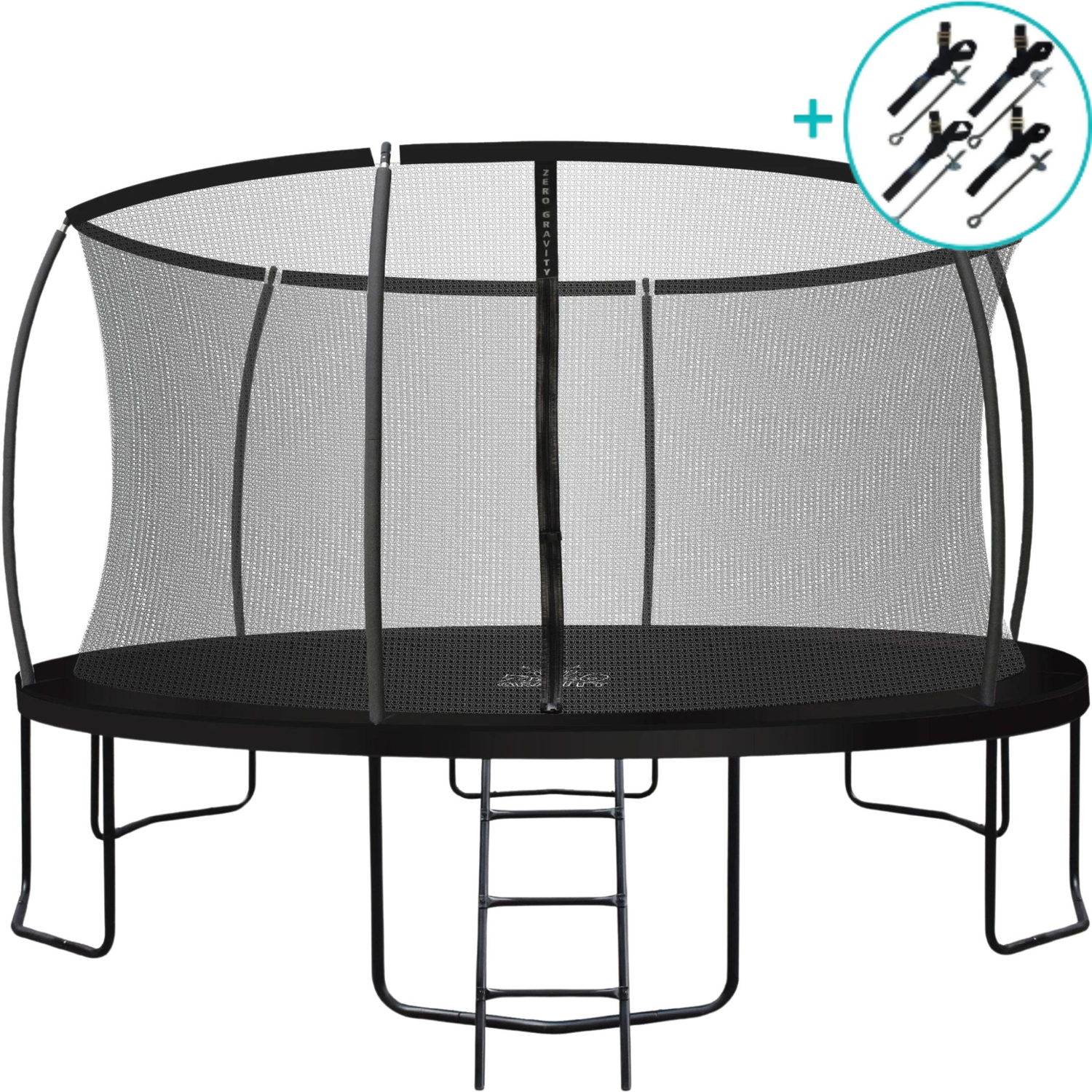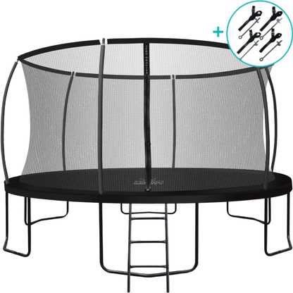 Everything safely stowed away and covered Our safety bars can be placed and covered on the jumping mat without any problems, together with the net and ladder. This protects the entire trampoline including the net from the effects of the weather and increases the service life of the trampoline.Note:In the case of trampolines from other manufacturers, the safety bars have to be screwed onto the trampoline frame, which is a complex process. Here, dismantling is only possible with tools and is very time-consuming. In addition, due to the long poles and the resulting overhang, no cover is possible.