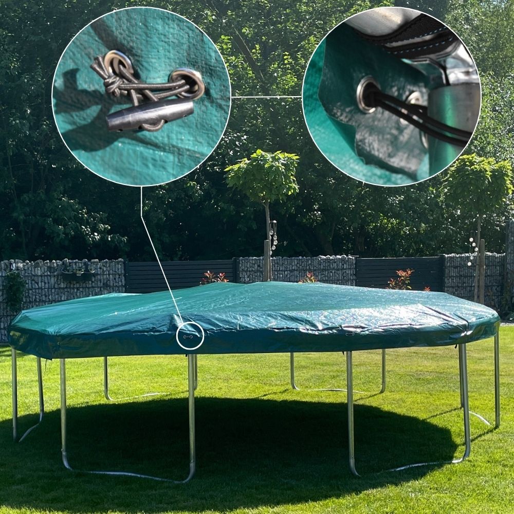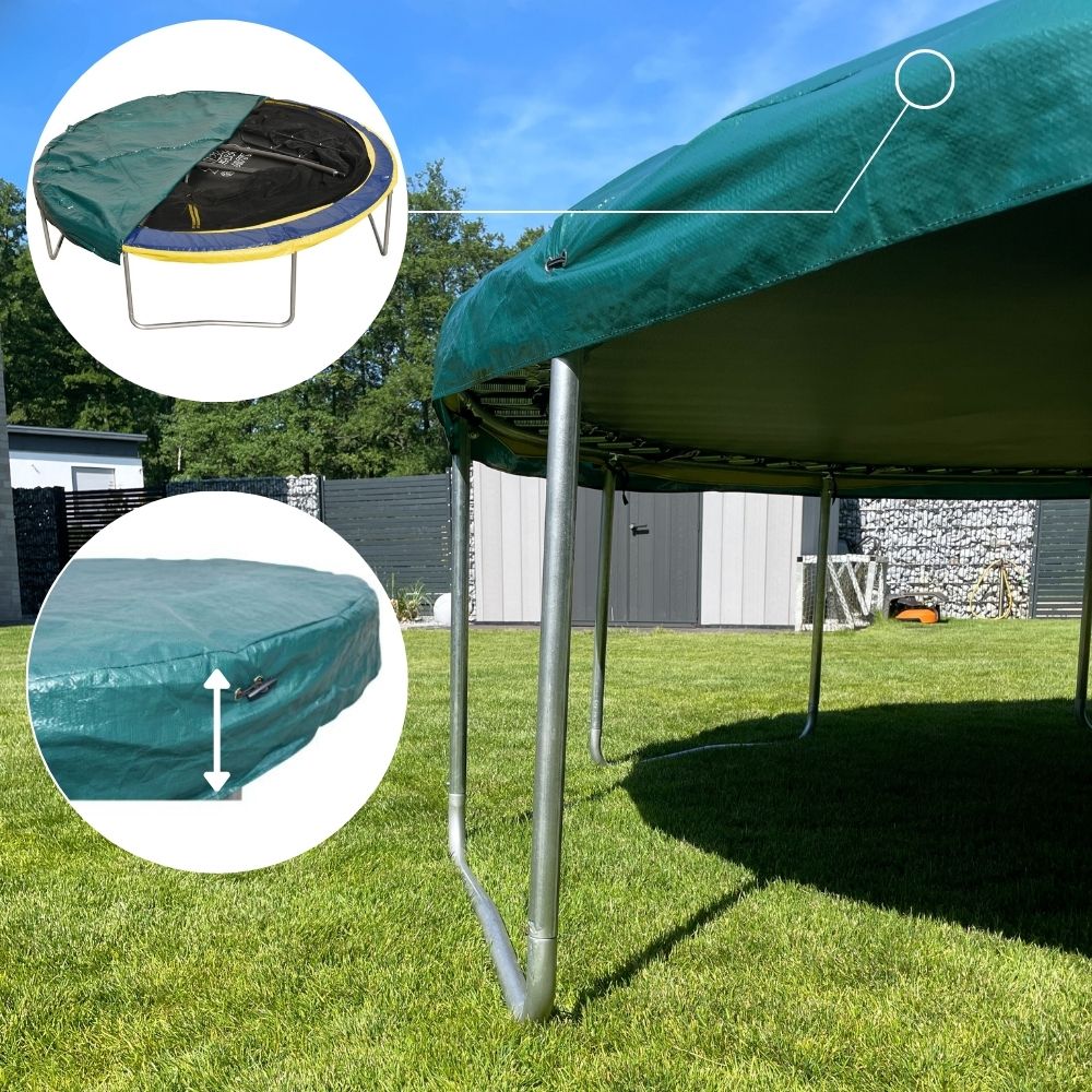 As specialists in trampolines, we know exactly what is important for a good trampoline cover and therefore use durable 180 g/m² polyethylene that is up to 50% thicker than other standard covers. In addition, all critical areas are reinforced with double material and metal eyelets. The fabric of our tarpaulins is extremely tear-resistant, so that falling branches and animals (e.g. cats and birds) do not pose a problem. In addition, the material used is UV-resistant and lasts forever.