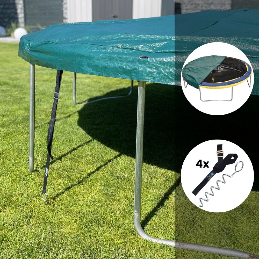 Our safety bars can be placed and covered on the jumping mat without any problems, together with the net and ladder. This protects the entire trampoline including the net from the effects of the weather and increases the service life of the trampoline.Note:In the case of trampolines from other manufacturers, the safety bars have to be screwed onto the trampoline frame, which is a complex process. Here, dismantling is only possible with tools and is very time-consuming. In addition, due to the long poles and the resulting overhang, no cover is possible.