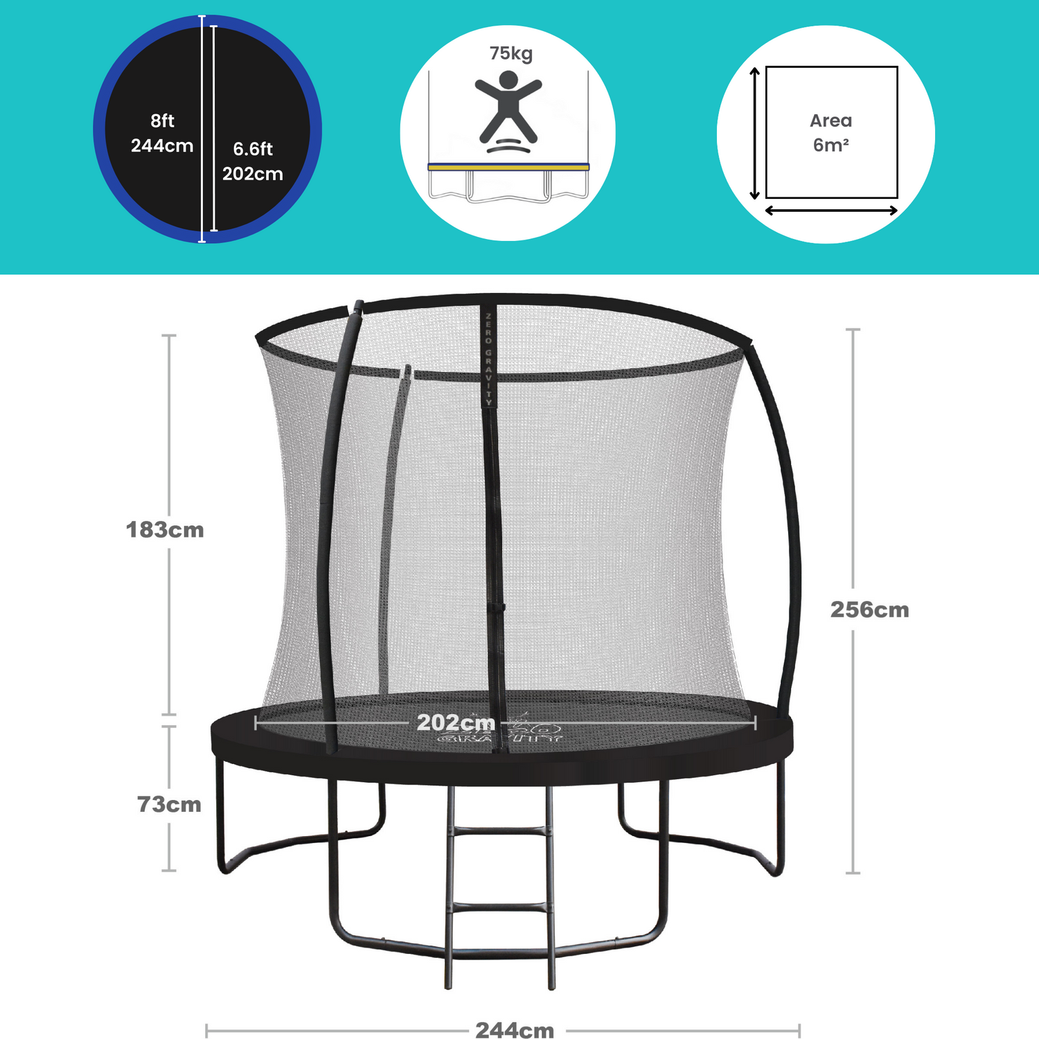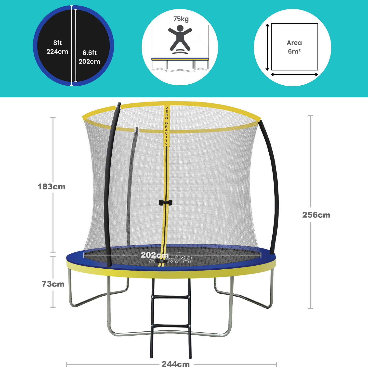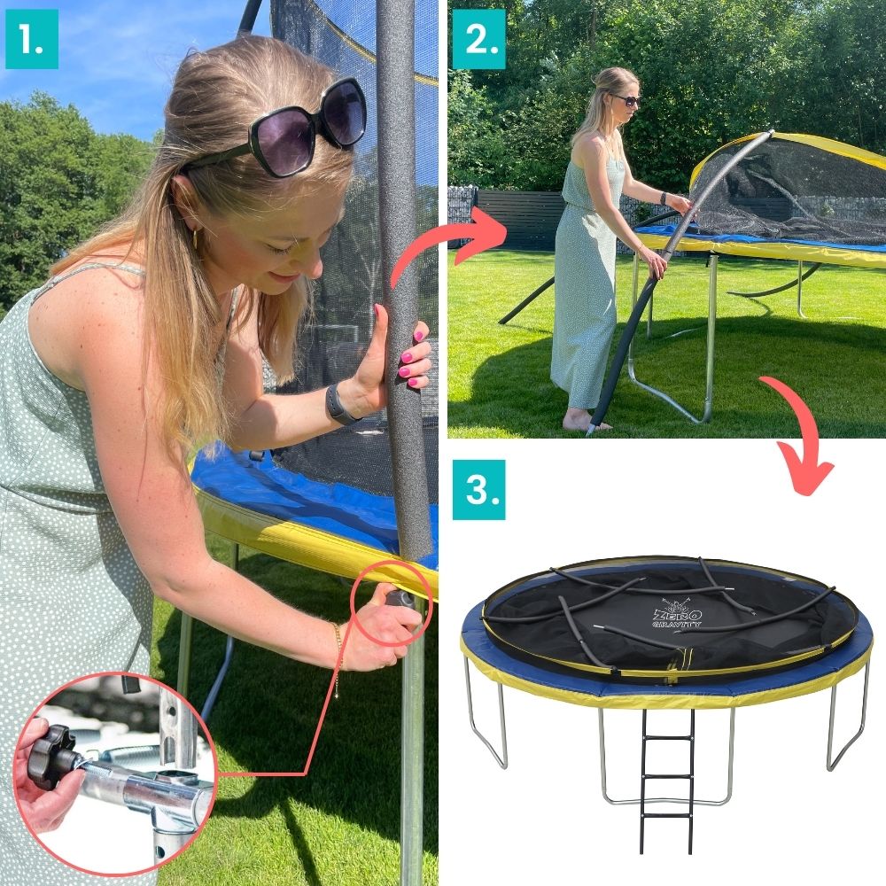 Thanks to our quick release system, the upper enclosure can be collapsed in as little as 5 minutes by unscrewing the screw lock and pulling out the poles then you simply fold the enclosure netting down onto to the jumping mat.